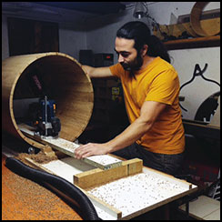Il utilise la technique de « douve », aussi appelée « stave ». Les segments de bois sont disposés à la verticale, ainsi, les ondes sonores suivent la fibre du bois ce qui optimise l'échange entre la peau de frappe et la peau de résonance